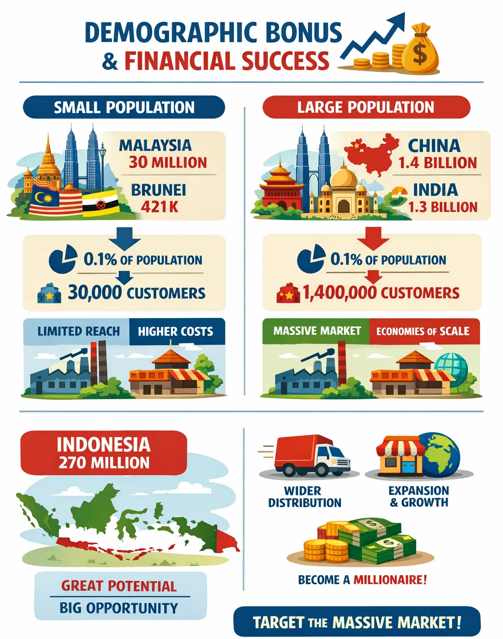karena itu jadi pebisnis di negara yang populasinya tinggi dibandingkan yang rendah, seharusnya bisa lebih mudah untuk sukses. tantangannya tinggal, bagaimana ia bisa mendistribusikan produknya seluas-luasnya ke warga negara tersebut.